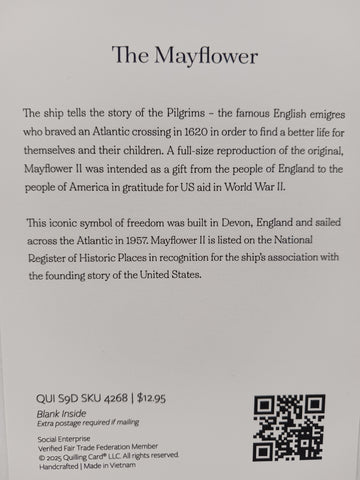 This exquisite three-dimensional quilled card, accompanied by a light blue envelope, features the iconic emblem of freedom that crossed the Atlantic Ocean. The Mayflower II, honored on the National Register of Historic Places, is celebrated for its pivotal role in America's founding narrative. The card remains blank inside for your personal message.