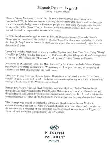 This montage was created by local artist and visual historian, Karen Rinaldo in collaboration with the staff of Plimoth Patuxet Museums as a remembrance of your visit to the museum and a reminder of the important lessons we stand to learn from the Pilgrims of Plymouth and the Native Wampanoag in the 17th century.